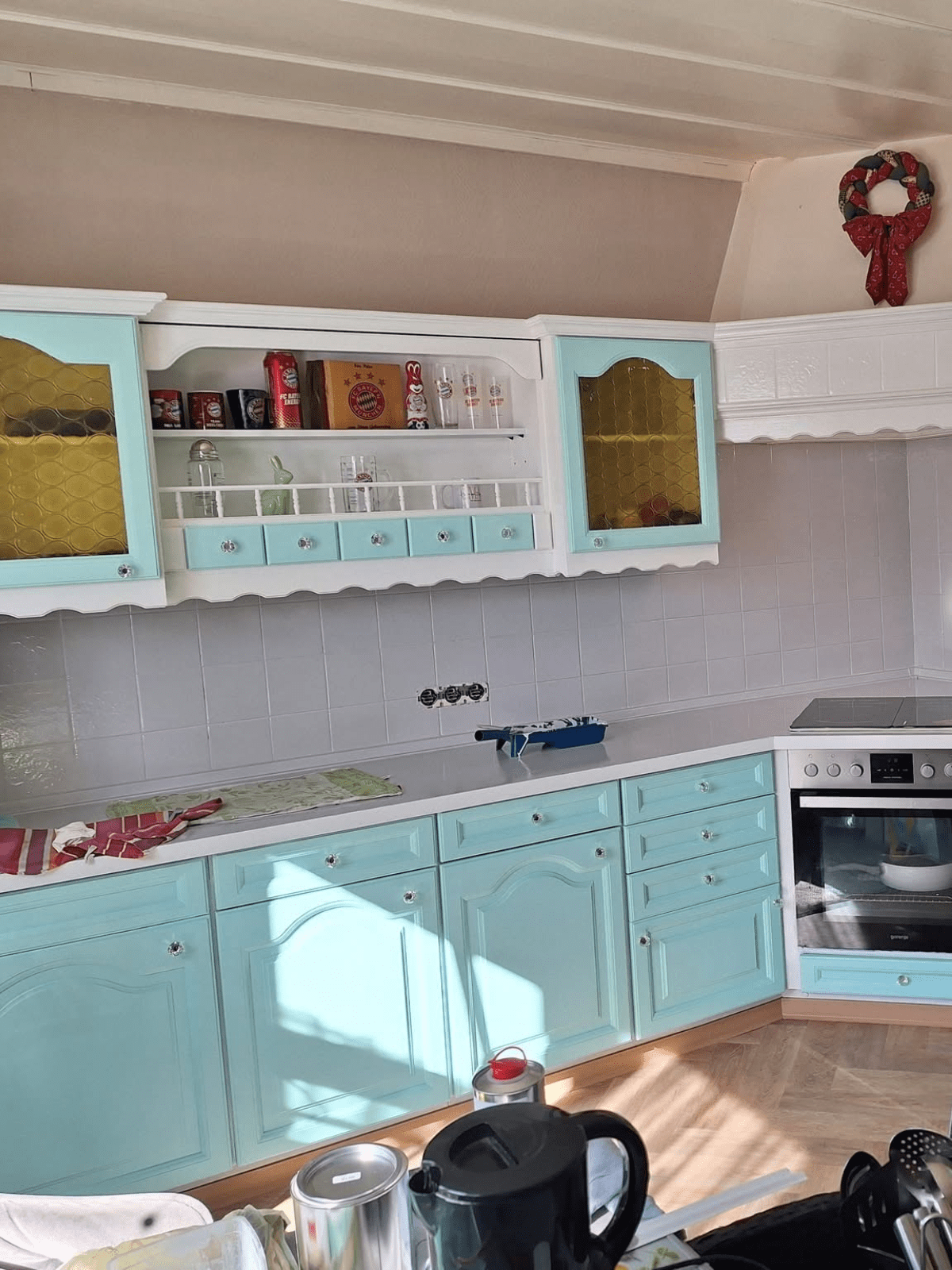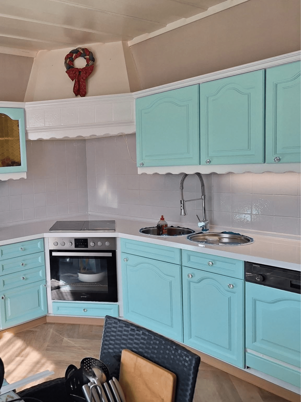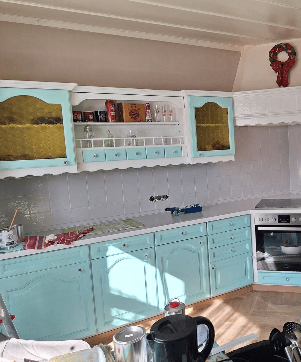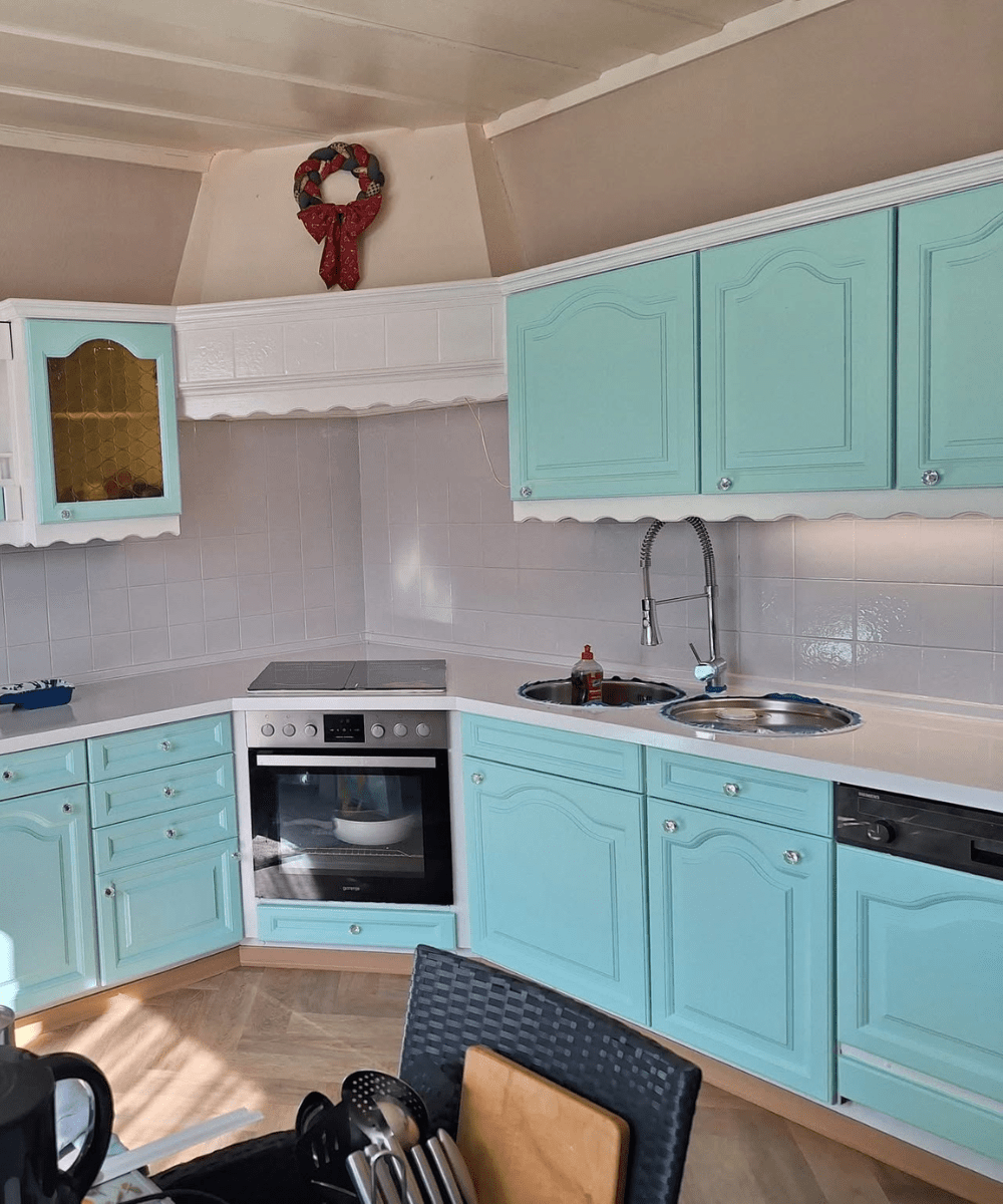 Disse køkkenfronter blev malet med møbelmaling i RAL-farven 6027 lysegrøn.