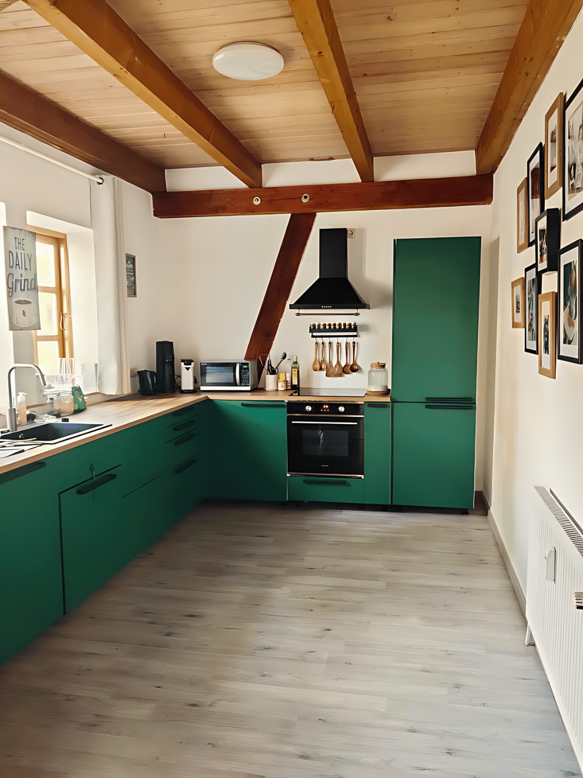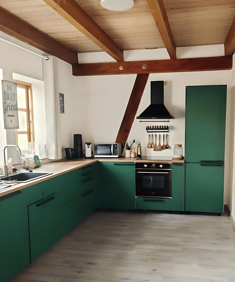 Disse køkkenfronter blev malet i RAL-farven 6028 fyrregrøn.