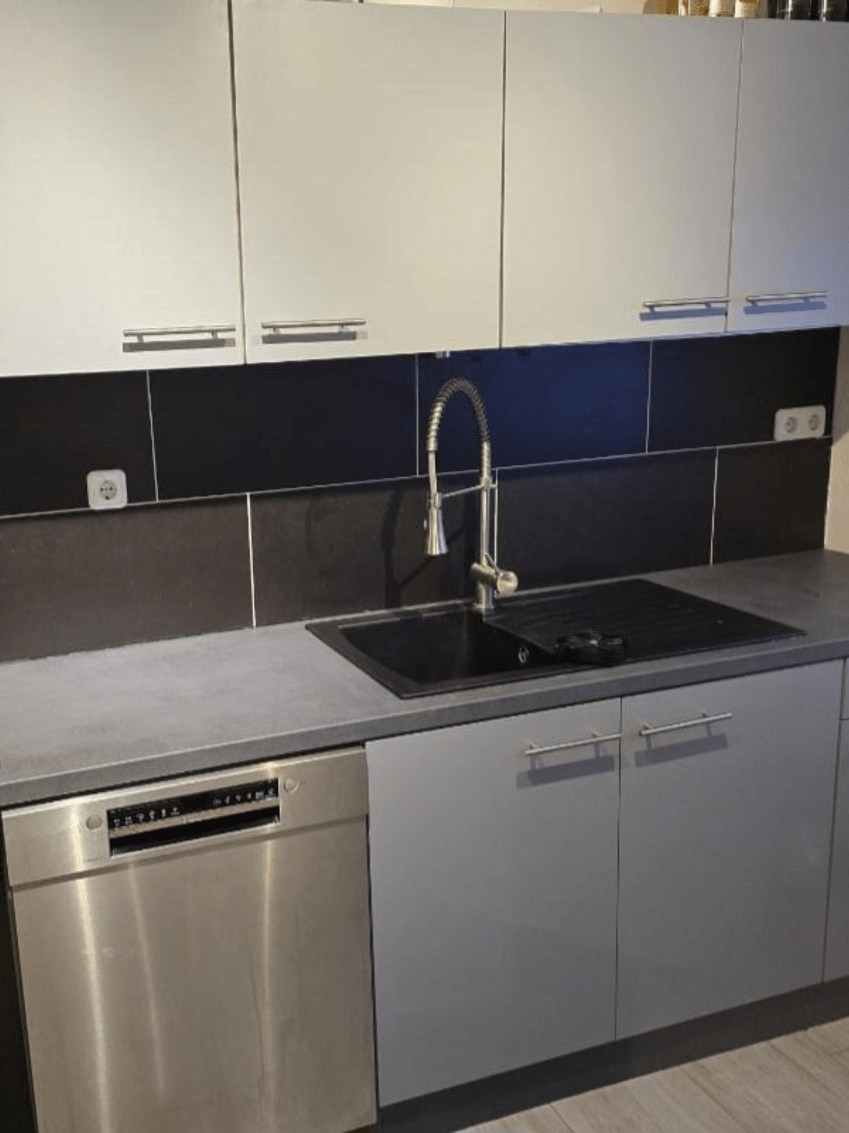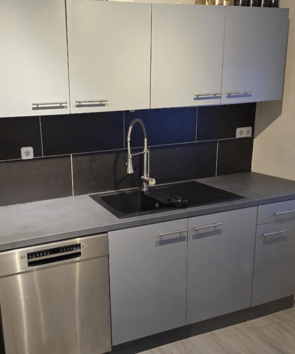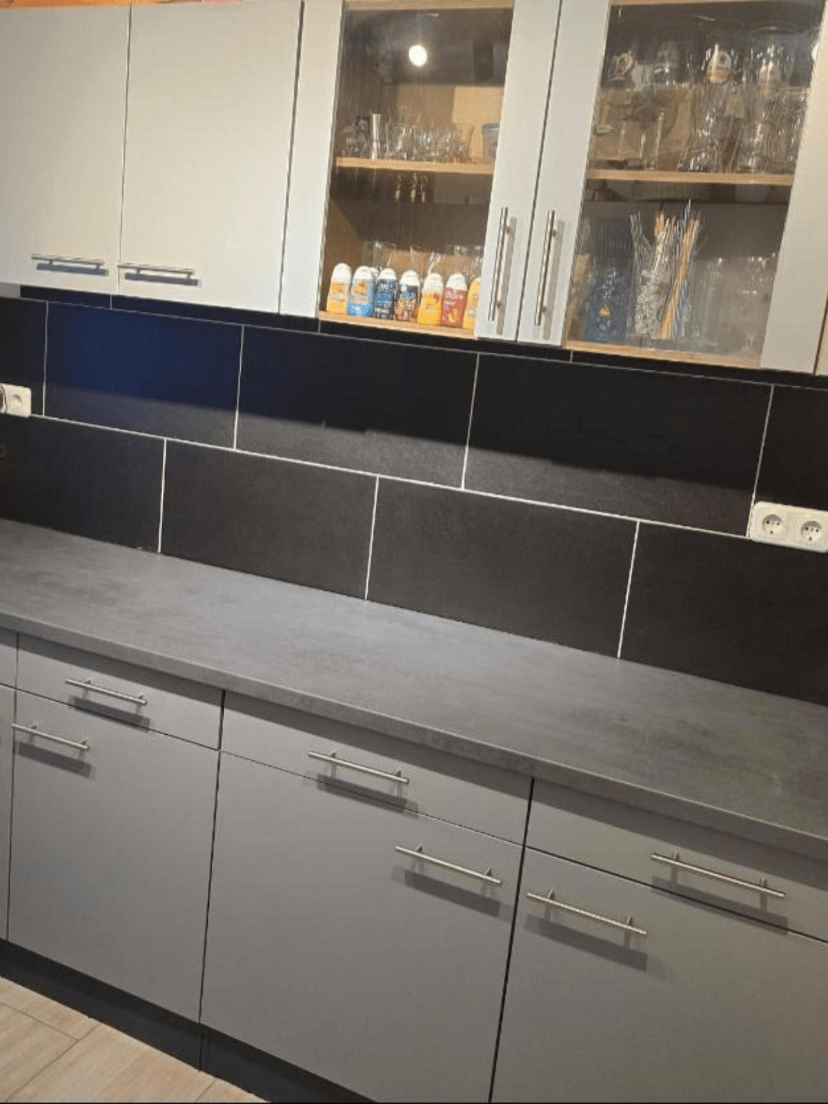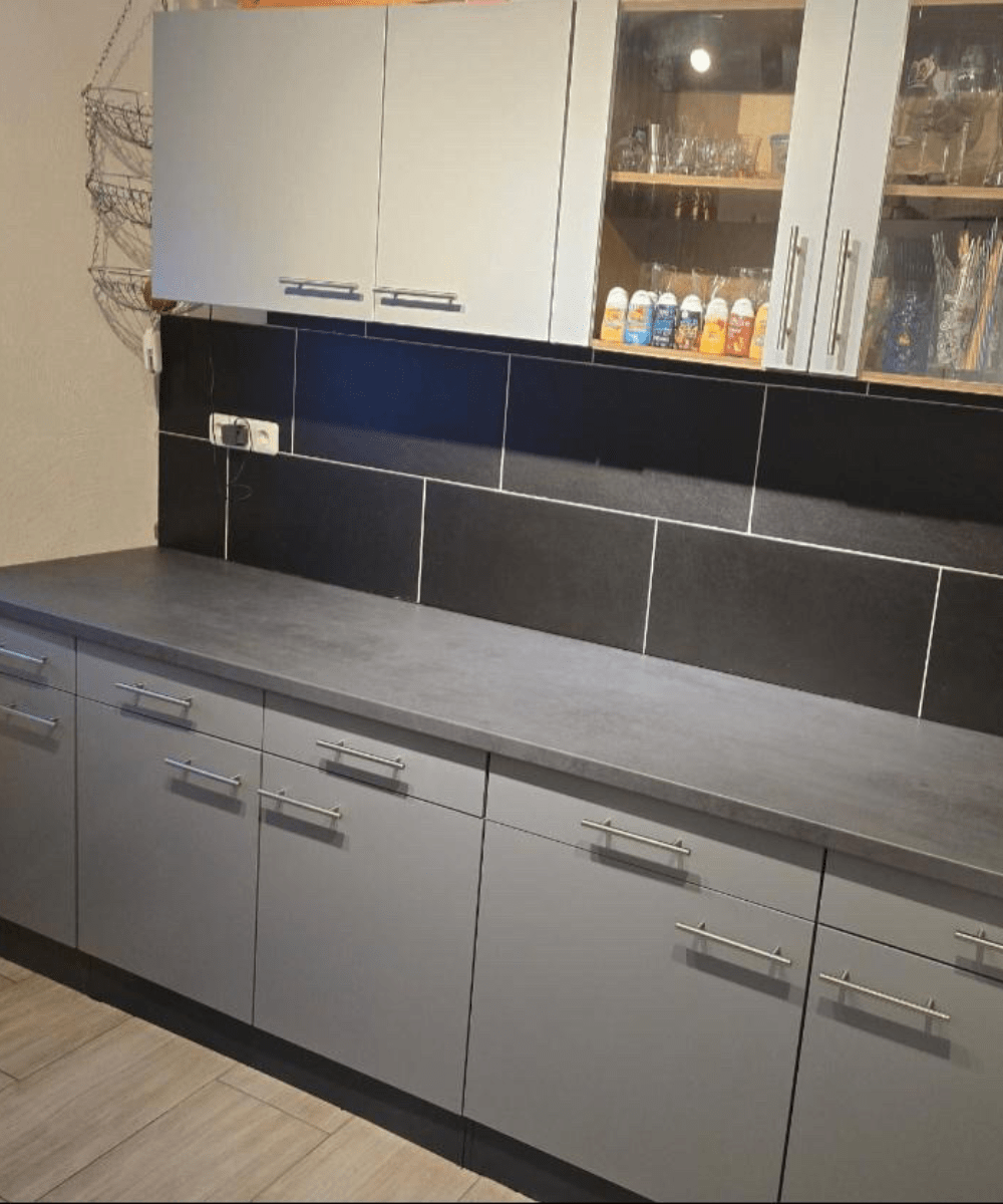 Disse køkkenfronter blev malet med møbelmaling i RAL-farven 7045 Telegrå.