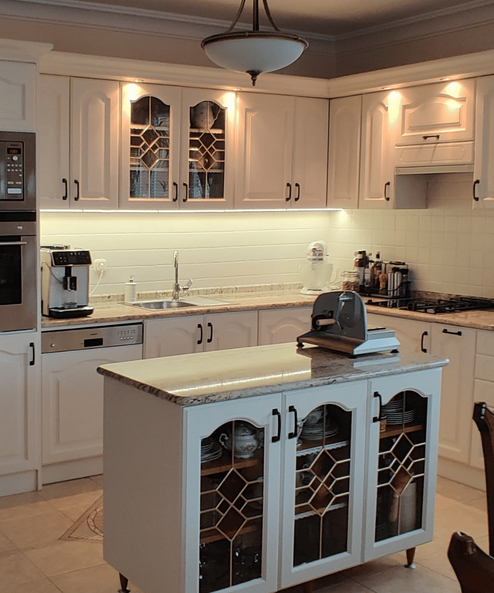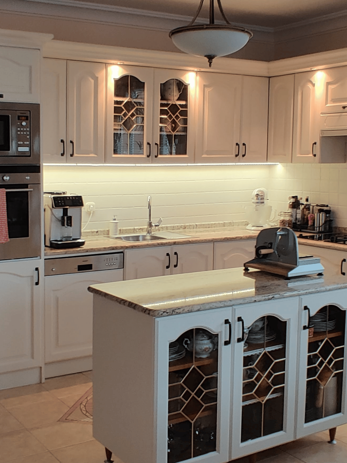 Disse køkkenfronter blev malet i RAL-farven 9001 cremehvid.