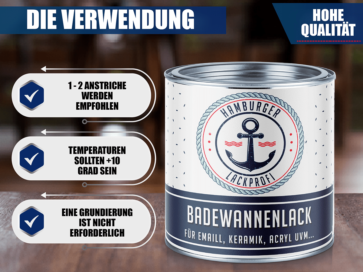 "Der Badewannenlack von Hamburger Lack-Profi hat meine alte Badewanne gerettet! Die Anwendung war dank der detaillierten Anleitung sehr einfach. Der Lack hat eine tolle Deckkraft und der Glanz ist beeindruckend. Ich bin froh, dass ich mich für dieses Produkt entschieden habe und werde es definitiv weiterempfehlen. Ein großartiges Produkt für DIY-Begeisterte!"