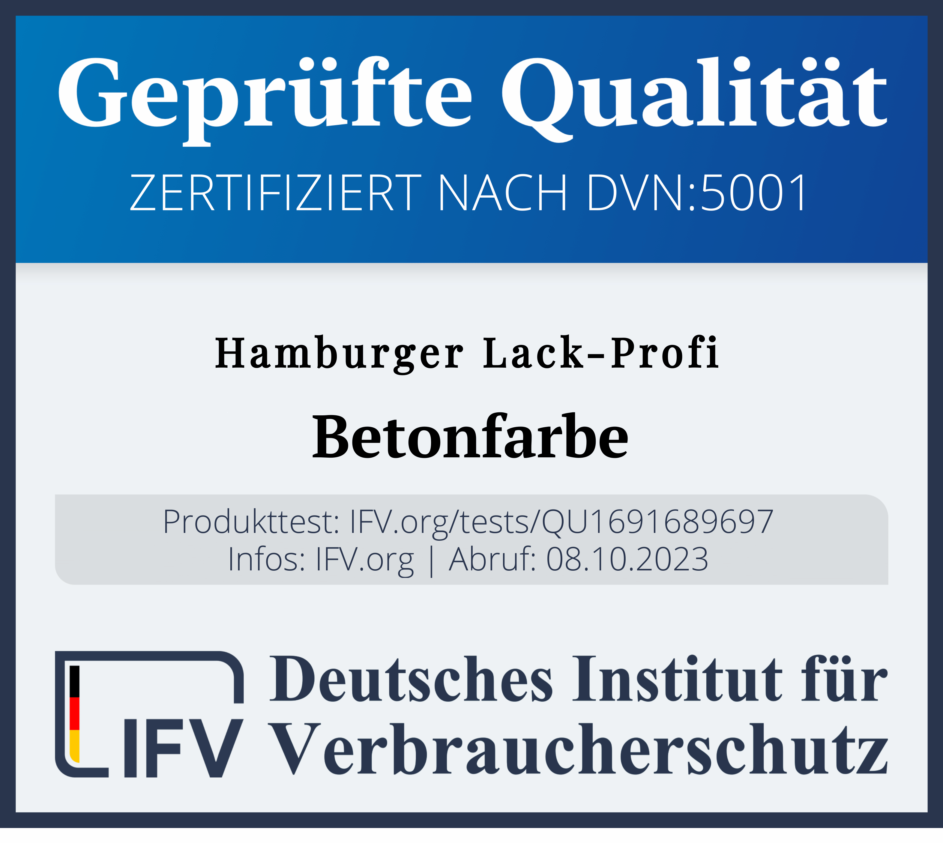 Unsere Betonfarbe hat die anspruchsvollen Tests des IFV (Deutsches Institut für Verbraucherschutz) durchlaufen und dabei die höchsten Standards erreicht. Wählen mit Vertrauen, wähle geprüfte Qualität!