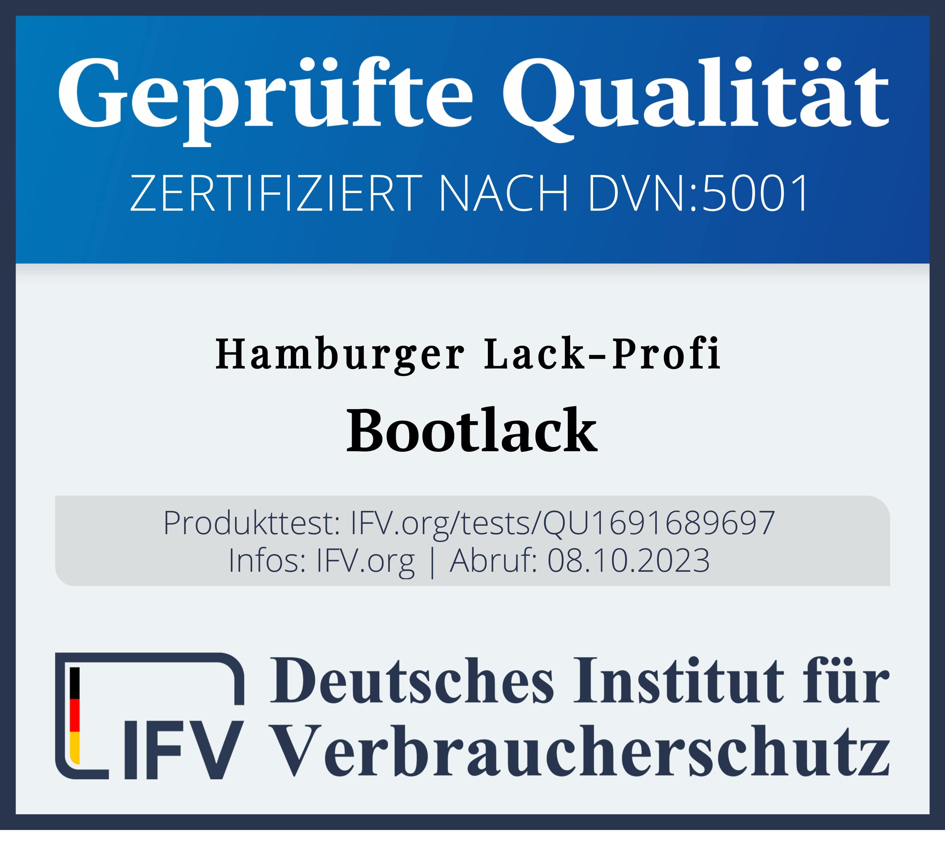 Unser Bootslack hat die anspruchsvollen Tests des IFV (Deutsches Institut für Verbraucherschutz) durchlaufen und dabei die höchsten Standards erreicht. Wählen Sie mit Vertrauen, wählen Sie geprüfte Qualität!